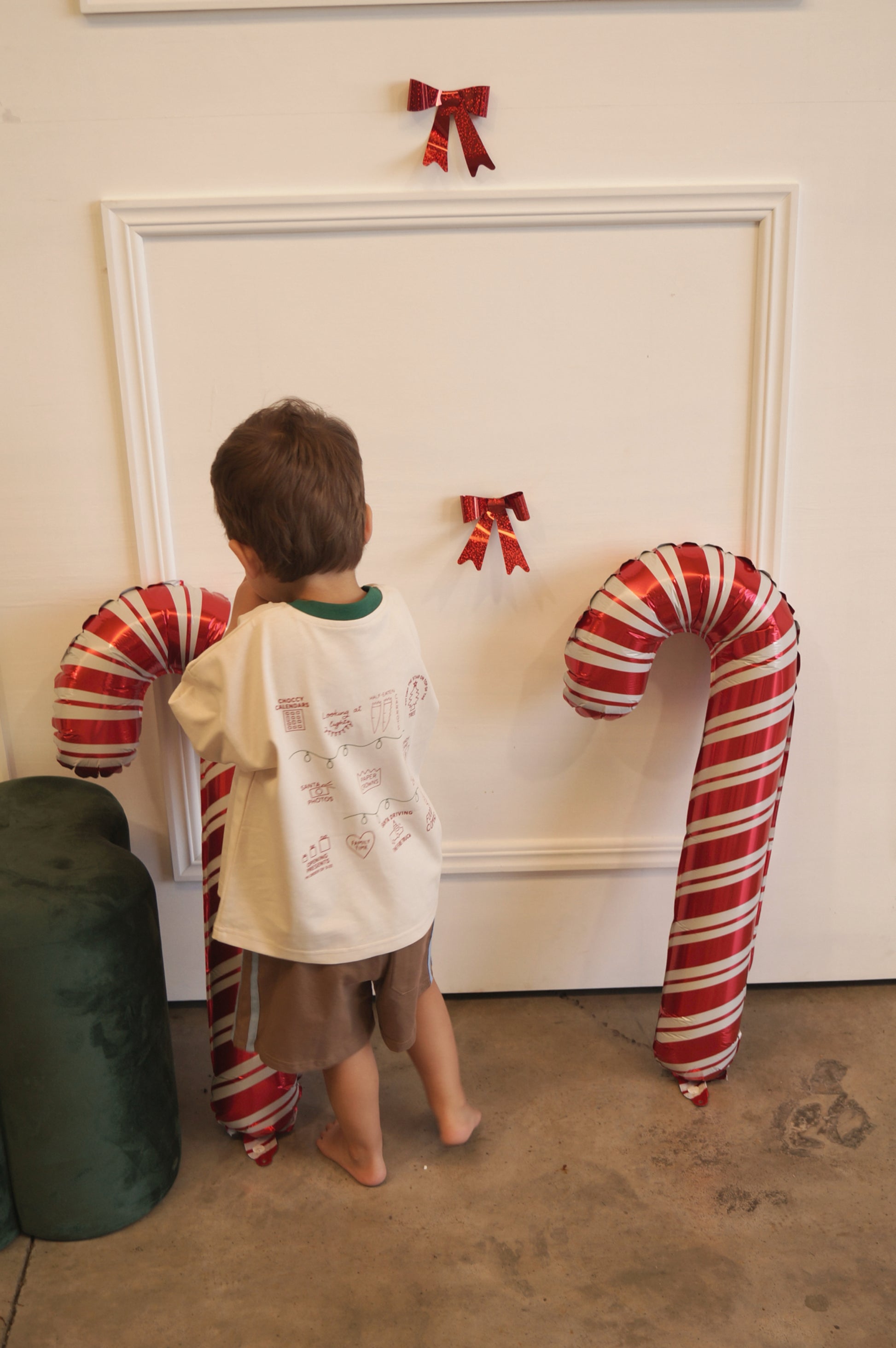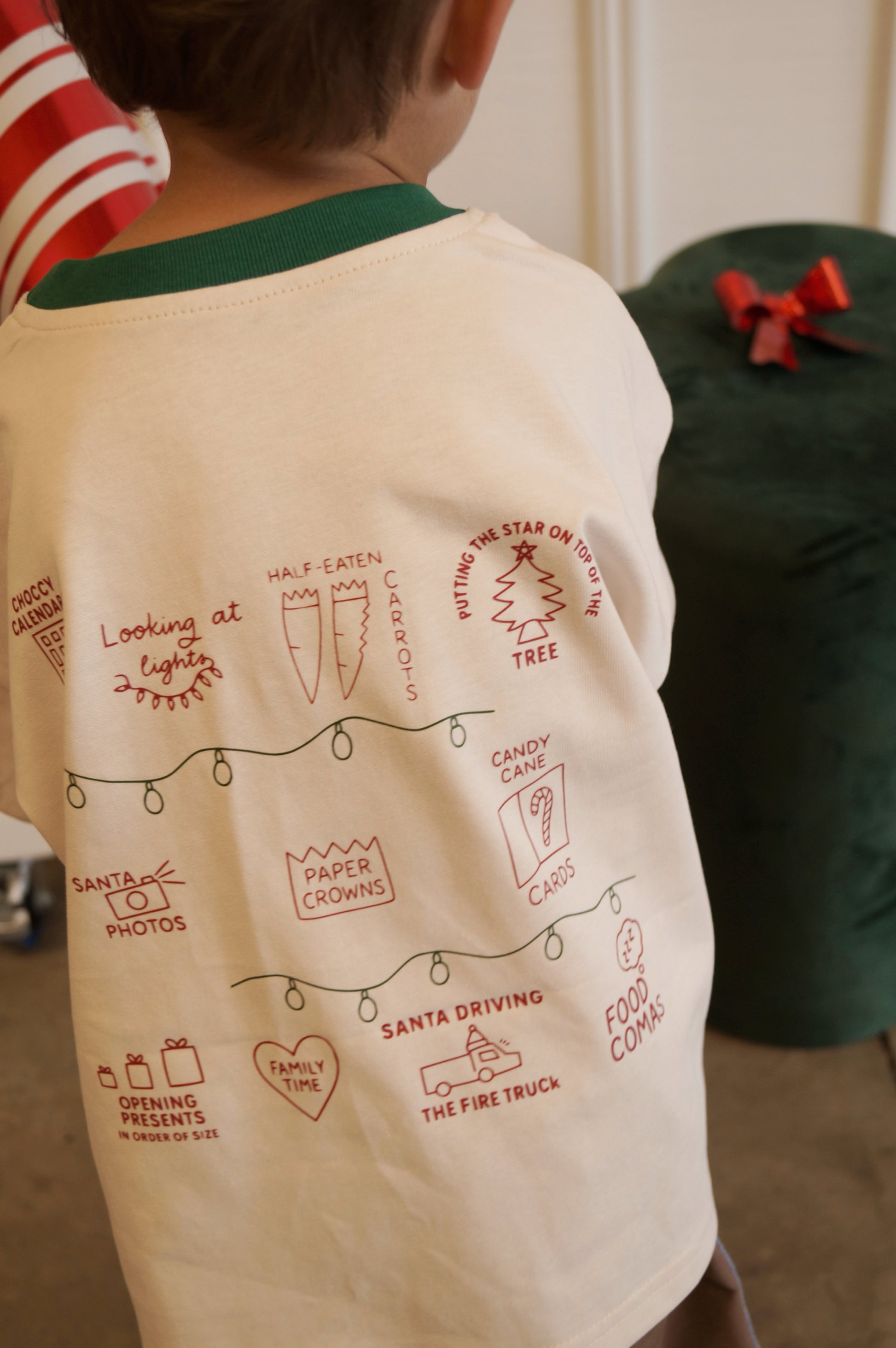 Oh what fun it is to be a kid at Christmas! This tee captures the true magic of Christmas with hand drawn pictures of familiar traditions on the back.
